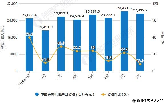 在进口金额方面,2018年3-8月中国集成电路进口金额整体呈增长趋势,2018年8月中国集成电路进口金额为27436百万美元,同比增长12.3%。