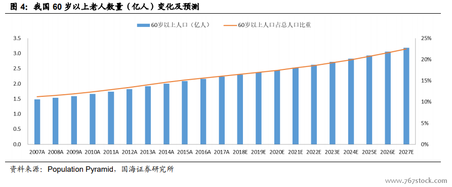 人口老龄化问题严重,60 岁及以上人口规模一直处于快速上涨的态势。根据populationpyramid 的数据,2007 年我国 60 岁以上老人数量为 1.49 亿人,占总人口比重 11.29%;2017 年我国 60 岁以上老人数量为 2.24 亿人,占总人口比重 16.1%,十年复合增速为 4.14%;预计 2027 年我国 60 岁以上老人数量为 3.19亿人,占总人口比重 22.50%,十年复合增速为 3.61%。另外,中国人口学家最新研究预计,到 2050 年,中国 65 岁以上的老年人口将达到 3.6 亿,占总人口比重超 1/4。