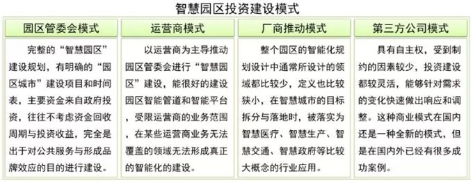 从全国范围来看,智慧园区投资建设模式主要包括园区管委会模式、运营商模式、厂商推动模式、第三方公司模式共四种。