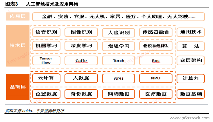 计算能力、算法以及数据是人工智能的三驾马车,缺一不可。人工智能从架构上分为三层,基础层、技术层和应用层。基础层主要是为人工智能技术(含算法)提供计算能力以及数据输入,包括超算/云计算平台,GPU/FPGA/NPU 等人工智能芯片,以及相关的数据资源以及大数据工具。技术层是整个人工智能的核心,包括算法和 AI 技术,该层是在基础层的基础上,开发算法模型,并通过海量识别训练和机器学习建模,开发面向不同应用领域的技术,如语音识别、图像识别等。应用层是将人工智能技术与应用场景结合起来,实现商业化落地,这个部分是国内人工智能发展最为活跃的领域,呈现出百花齐放的态势,主要应用包括智能安防、智能投顾、智能客服、智能家居、无人驾驶、机器人等多个领域。
