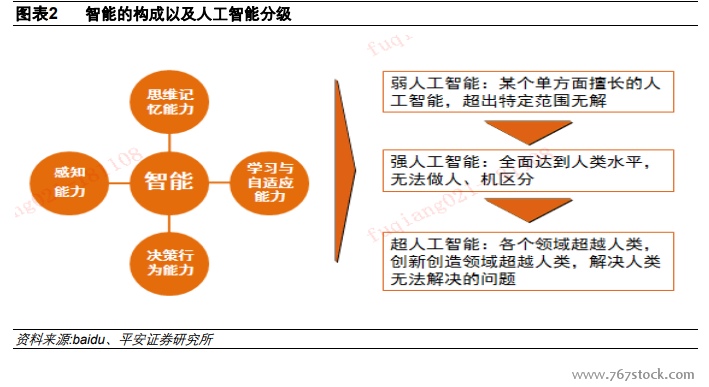 行业发展路线之争也由来已久,但“弱”人工智能将是业界最终选择。所谓智能,是指人类感知、思维记忆、学习与自适应、决策等方面的能力,而人工智能就是对这些能力进行的模拟。目前,研究界按照人工智能对上述能力的模拟程度,分为弱人工智能、强人工智能以及超人工智能,三者是递进关系,超人工智能已经是人工智能对人的全面超越和替代。由于发展目标的不同,带来的也是完全不同的发展路径。