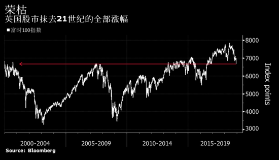 英国股市投资者挥手告别过去18年的累计涨幅。富时100指数周三收于1999年底的点位之下,周四延续跌势。基准指数周四下跌3.2%,是2016年6月以来最大跌幅,追平英国脱欧公投次日的下跌幅度。