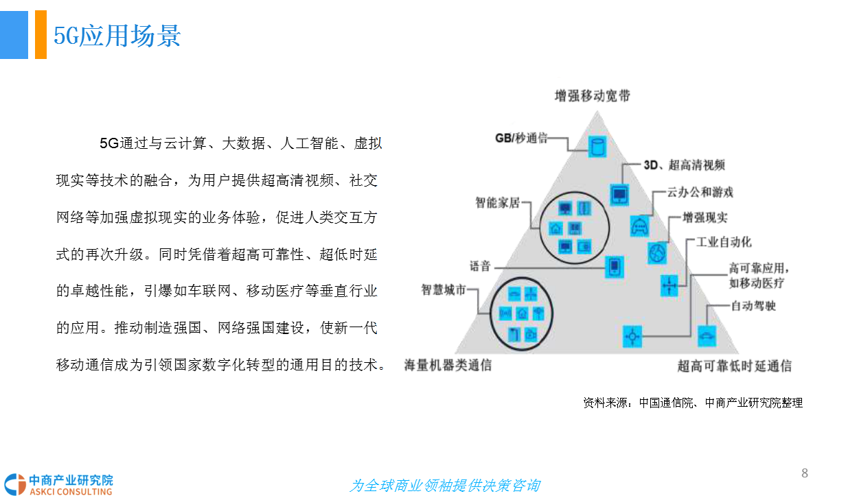 5G网络作为第五代移动通信网络,其峰值理论传输速度可达每秒数十Gb,这比4G网络的传输速度快数百倍,整部超高画质电影可在1秒之内下载完成。5G通过与云计算、大数据、人工智能、虚拟现实等技术的融合,在多个领域展开应用。