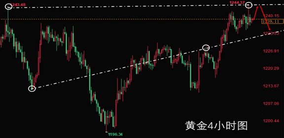 4小时图显示,高位震荡;黄金短线涨势暂缓,MACD零轴之上交织在一起形成死叉,且下行动能扩张,RSI指标也呈震荡下行趋势,这或暗示黄金短线存在一定的回调空间,不过,MA均线整体依旧保持上行趋势,布林带收口后并没有明显的拐头偏向,这暗示金价短线的面临方向的选择。还是处于较强行情之中,同时,黄金反复上攻不破位,那么短线就有走调整的机会;综上所述,操作上天硕斩金建议回调做多为主,反弹高空为辅,重点关注上方1245一线阻力,下方1232一线支撑;
