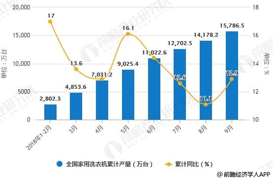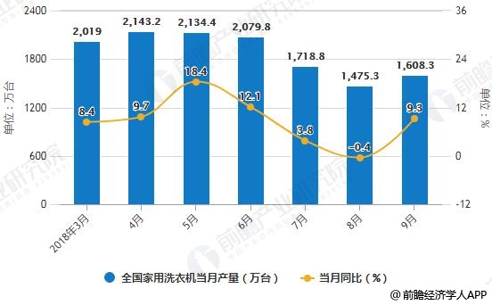 据前瞻产业研究院发布的《中国洗衣机行业产销需求与投资预测分析报告》统计数据显示,2018年3-7月全国家用洗衣机产量逐渐下降,2018年7月全国家用洗衣机产量为532.4万台,同比下降3.6%。2018年8-9月全国家用洗衣机产量有所回升,2018年9月全国家用洗衣机产量为652.1万台,同比下降2.8%。2018年1-9月全国家用洗衣机产量为15786.5万台,同比增长12.9%。