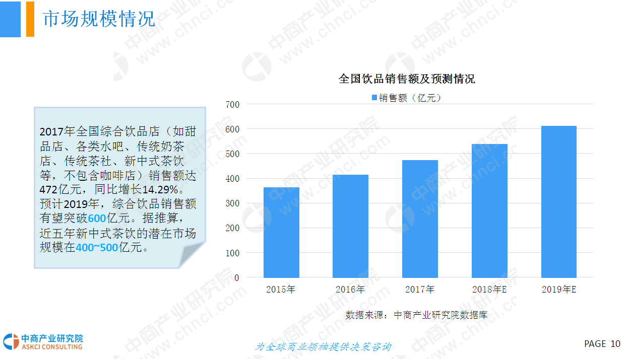 目前,奶茶行业异常火爆,大到商超、电影院,小至街头巷尾,店遍地开花。当前奶茶特别是新式奶茶行业市场潜力巨大,已成为创业投资、代理加盟的热门行业。据预测,2019年全国综合饮品销售额有望突破600亿元,新中式茶饮的潜在市场规模在400~500亿元。特别是近两年增长得特别快,成饮品市场新宠。