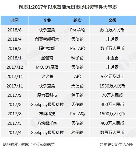 2017年以来,国内智能玩具市场投资事件较为频繁,但这些受资企业大多还在发展初期,由此可见,智能玩具市场在我国尚有一片蓝海。