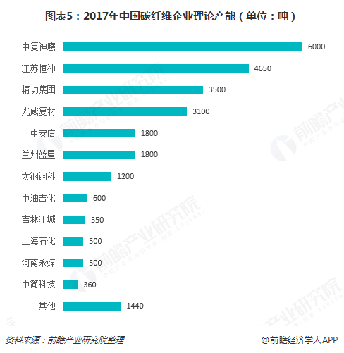 2017年,我国碳纤维理论产能达2.60万吨。其中,产能千吨以上的公司仅有7家,分别是中复神鹰、江苏恒神、精工集团、光威复材、中安信、兰州蓝星、太钢钢科。中复神鹰产能最高,达6000吨。