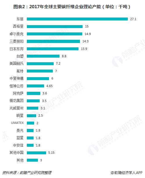 2017年,日本东丽、德国西格里、美国卓尔泰克(已被东丽收购)、三菱丽阳、日本东邦五家企业合计产能8.52万吨,占全球总产能的58%。其中,日本东丽公司仍是全球碳纤维生产第一大公司,2017年产能达到2.71万吨,2013年公司完成了美国卓尔泰克公司收购,卓尔泰克2017年产能达1.49万吨。