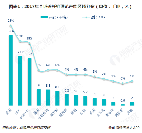 近年来,受需求端稳步增长刺激,全球碳纤维理论产能不断增加。2017年,全球全球碳纤维理论产能达到14.71万吨。而且全球碳纤维产能集中于美国、日本、中国三大地区,呈现高度集中的特征。