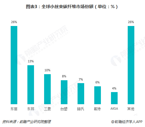 不仅在产能方面领先,日本东丽公司碳纤维产品覆盖了从小丝束至大丝束全系列范围,同时拥有全球最大的小丝束碳纤维产能,是名副其实的全球龙头企业。具体数据显示,日本东丽在全球小丝束碳纤维市场份额达到26%,高出第二名的日本东邦13个百分点。