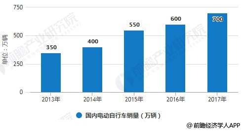 2013年国内电动自行车销量约350万台,到了2014年国内电动自行车销量约400万台,2015年国内电动自行车销量增长至约550万台,2016年国内电动自行车销量约600万台,截止到2017年国内电动自行车销量达到700万辆,可见电动自行车的市场十分可观。