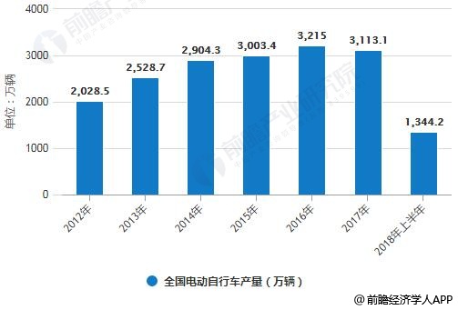 据前瞻产业研究院发布的《中国电动车行业市场需求预测与投资战略规划分析报告》统计数据显示,2012-2017年全国电动自行车产量有增有减。其中2016年全国电动自行车产量最高,产量为3215万辆。2012年相对较少,产量为2028.5万辆。截止到2017年全国电动自行车产量达到了3113.1万辆。,2018年6月全国电动自行车产量达到294.9万辆,与上年6月相比增长了9.9个百分点。2018年上半年全国电动自行车产量总产量为1344.2万辆,同比增长7.74%。