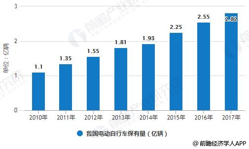 2010年我国电动自行车保有量已经突破1亿辆,达到1.1亿辆。到了2015年我国电动自行车保有量超2亿辆。截止到2017年我国电动自行车保有量达到了2.82亿辆。