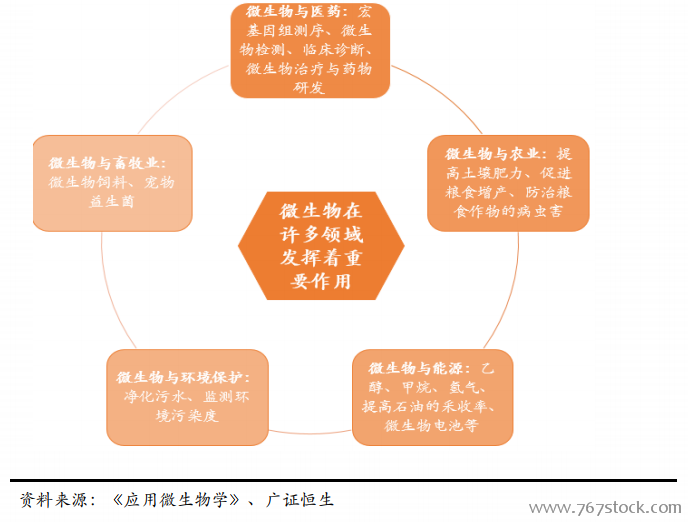微生物在医药、农业、能源、环境保护和畜牧业领域都发挥着重要作用,其中最突出的贡献还是在医药领域。医药:可以说微生物发现史就是一部人类与疾病的抗争史。从 19 世纪后期微生物在蚕病及狂犬病疫苗等方面发展以来,由病原微生物改造制成的预防疾病的疫苗对人类贡献巨大;1929 年,青霉素被发现,帮助人们战胜了结核、疟疾、霍乱、破伤风、白喉、鼠疫等一系列传染病;至今微生物及其代谢产物的研究为人们产出了胰岛素、干扰素等贵重药物,并成为发现新药物的源泉,现已发现多种抗肿瘤药物及免疫调节药物,促进疾病防治水平的不断提高。农业:微生物在提高土壤肥力、促进粮食增产、防治粮食作物的病虫害、防止粮食霉腐变质等方面,都不可或缺。能源:微生物技术在新能源开发领域中有广阔的应用潜力,对能源的可持续发展有重要意义。环境保护:利用微生物来净化生活污水和有毒工业污水并监察环境的污染度,效果显著。畜牧业:微生物发酵饲料及宠物益生菌对促进动物生长发育,提高免疫力、防病治病,改善饲料适口性和转化率等方面具有明显的作用。