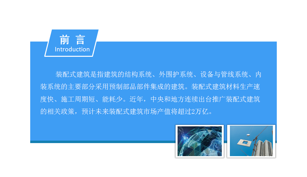 装配式建筑是指建筑的结构系统、外围护系统、设备与管线系统、内装系统的主要部分采用预制部品部件集成的建筑。装配式建筑材料生产速度快、施工周期短、能耗少。近年,中央和地方连续出台推广装配式建筑的相关政策,预计未来装配式建筑市场产值将超过2万亿。