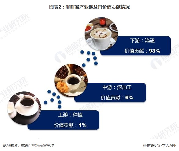 而相关调研结果显示,咖啡各产业链中价值贡献最大的为下游的流通环节,这一环节的价值贡献高达93%。