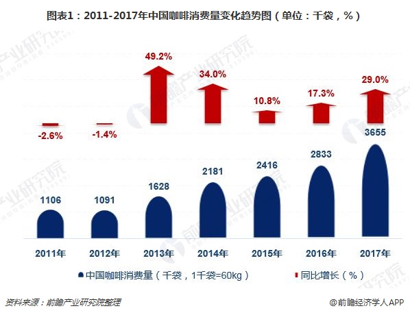 统计数据显示,近年来我国咖啡消费量增长迅猛,2013年以来均保持10%以上的增长。2017年中国咖啡消费量为3655千袋,同比增长了29.0%。而业内普遍认为中国咖啡将在2018年迎来爆发年。