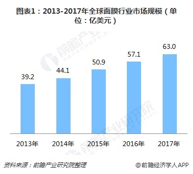 护肤品作为一种日用消费品,已经被越来越多的消费者所接受。全球化妆市场稳步增长,而面膜作为全球女性消费者在日常护肤中最常消费的一类护肤产品,也保持着稳健的增长态势。数据显示,2013-2017年全球面膜市场规模年均复合增长率达到12.6%,2017年全球面膜市场规模为63亿美元。