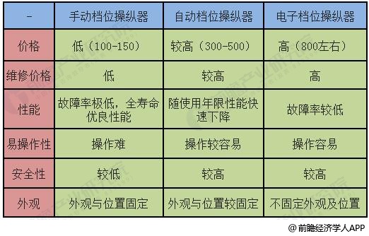 根据变速箱形式划分,现在市面上的变速操纵器可以分为手动挡汽车配套手动挡变速操纵器,平均价格在110元左右;以及自动挡汽车配套的自动挡变速操纵器,相比于手动变速操纵器技术提升,价格比手动挡变速操纵器增加 200元。 随着汽车电子的不断发展,也开始电子化,2001 年开始电子变速操纵器开始进入市场,与传统自动挡变速操纵器一样与自动挡汽车配套。