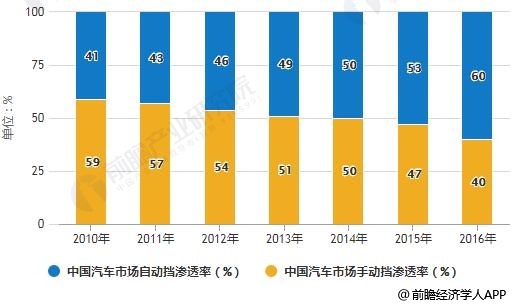 2010-2016年中国汽车市场手动、自动挡渗透率统计情况