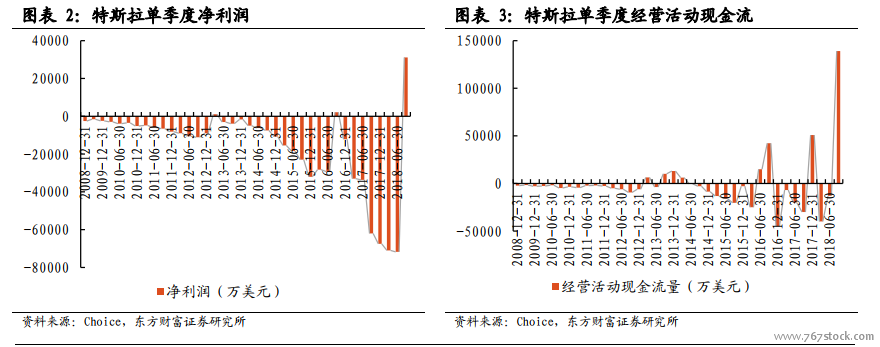 历史上特斯拉出现过两次较大的业绩爆发。第一次为 2012 年第四季度,第二次为 2016 年第三季度,每次都对应了新车的销量爆发:2012 年 8 月 Model X上市,为首款主销车型;2016 年第三季度 model S 和 X 的销量再上台阶。历史上特斯拉也曾盈利过两次,分别为 2013 年第一季度和 2016 年第三季度,和营收、销量爆发的时点对应,但盈利绝对值很小,本次大幅盈利说明 Model 3 才是特斯拉大幅盈利的主要车型。