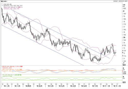 澳元兑美元延续近期的弱势运行格局,最新交投于0.72关口附近。尽管今年澳元表现惨淡,但不少大的商业银行对于澳元明年的表现寄予了厚望,主要是分析认为澳洲国债收益率有望上升,预计明后两年澳洲国债通胀率将走高,经济将保持强势增长。因此澳洲联储可能会在2019年开始加息。而美国国债收益率目前或已见顶,预计将在2019年进一步轻微走低,利差上的缩窄,将是有利于澳元的因素。此外,若是明年人民币复苏,也将扶持澳元走出困境。因此若是澳元在0.71-0.72的区域筑成底部,则明年澳元有望走出一波较大幅度的上升行情。因此对于该货币对,倾向逢低入多,可考虑分别在0.7180、0.7120设置订单多头澳元。