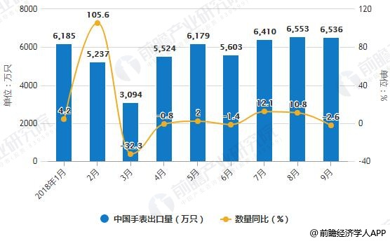 2018年1-9月中国手表出口统计及增长情况