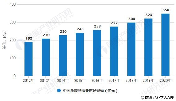 中国的手表制造业市场规模由2012年约192亿元增长至2016年约258亿元,复合年增长率约为7.7%,主要受行业参与者在设计升级及产能方面的创新技术,以及中国在智能及绿色生产、质量改进、优化结构及创新型生产等不同领域加快产业转型所推动,惟部分因2015年及2016年全球需求持续疲弱所抵销。中国手表制造业市场规模估计由2017年约277亿元增至2020年约350亿元。
