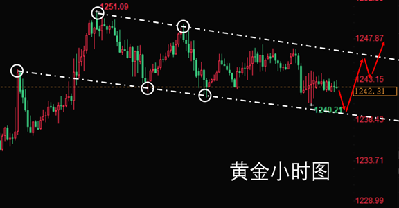 4小时图显示,黄金短线正在测试1241美元附近的支撑,隔夜金价小幅回落,因美元指数反弹收复97关口,金价已经跌穿了收敛三角形态的下轨趋势线支撑,目前有回踩趋势线的迹象,不过上行将受到密集均线的压制。与此同时,黄金还处于下降旗形通道中,较强支撑位于1239美元附近,该位置也是60周期均线的支撑水平。短线来看,黄金的风险偏向震荡下行。操作上天硕斩金建议目前以区间操作为主,区间破位再做思路上的调整,下方重点关注1238一线支撑,上方关注1250一线阻力;