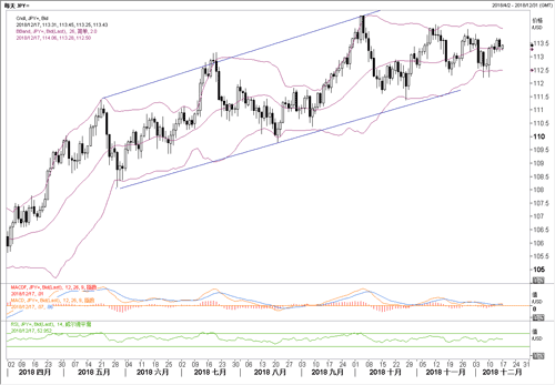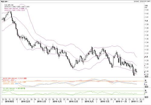 上周五,美元指数强势爆发,刷新2017年5月以来新高至97.71。稍早公布的美国11月零售销售增幅优于预期,而中国和欧元区最新出炉的经济数据表现疲弱,打压欧元和人民币下滑,英国脱欧担忧则令英镑承压,这使得美元多头受到多重提振。对于英镑来说,可以说是内外交困,一方面脱欧进程磕磕碰碰始终施压英镑,另一方面美元指数的居高不下,都抑制着英镑有任何的良好表现。从技术面看,MACD绿色动能柱基本持平,KDJ指标低位再度拐头向下,显示汇价下行风险依然较大。汇价下行的初步支撑位于1.2574,更关键支撑位于1.2539。一直以来,我们曾提醒过,由于有脱欧这个不确定因素的存在,英镑何时触雷都难以预料,总之随着脱欧最后期限的越发临近,我们就越要以防止英镑出现大幅下滑的风险出现为主。因此操作上奉行逢高空英镑的想法令人安心。