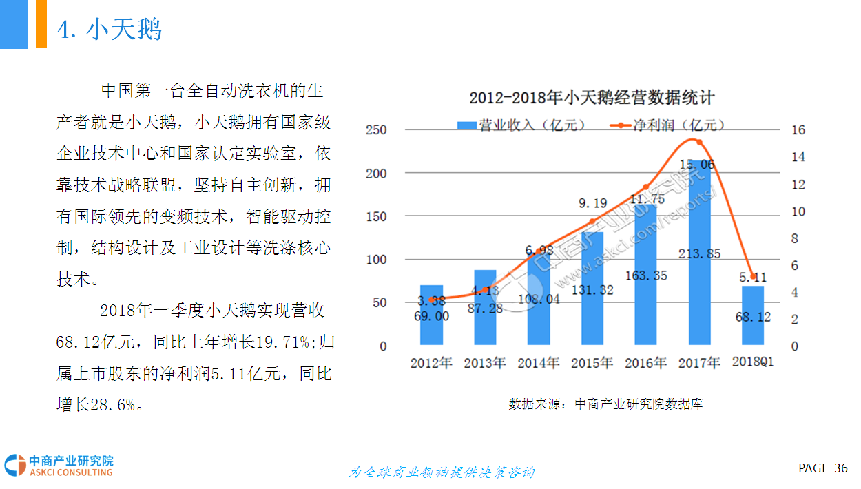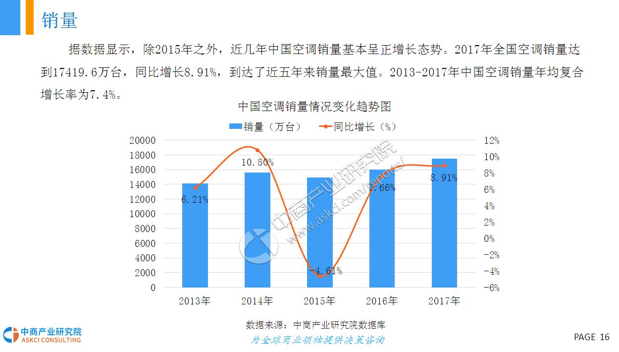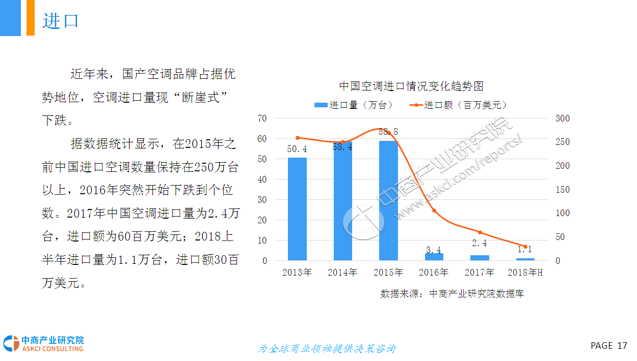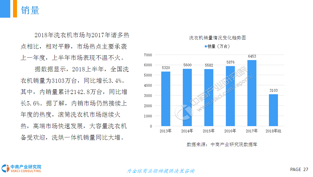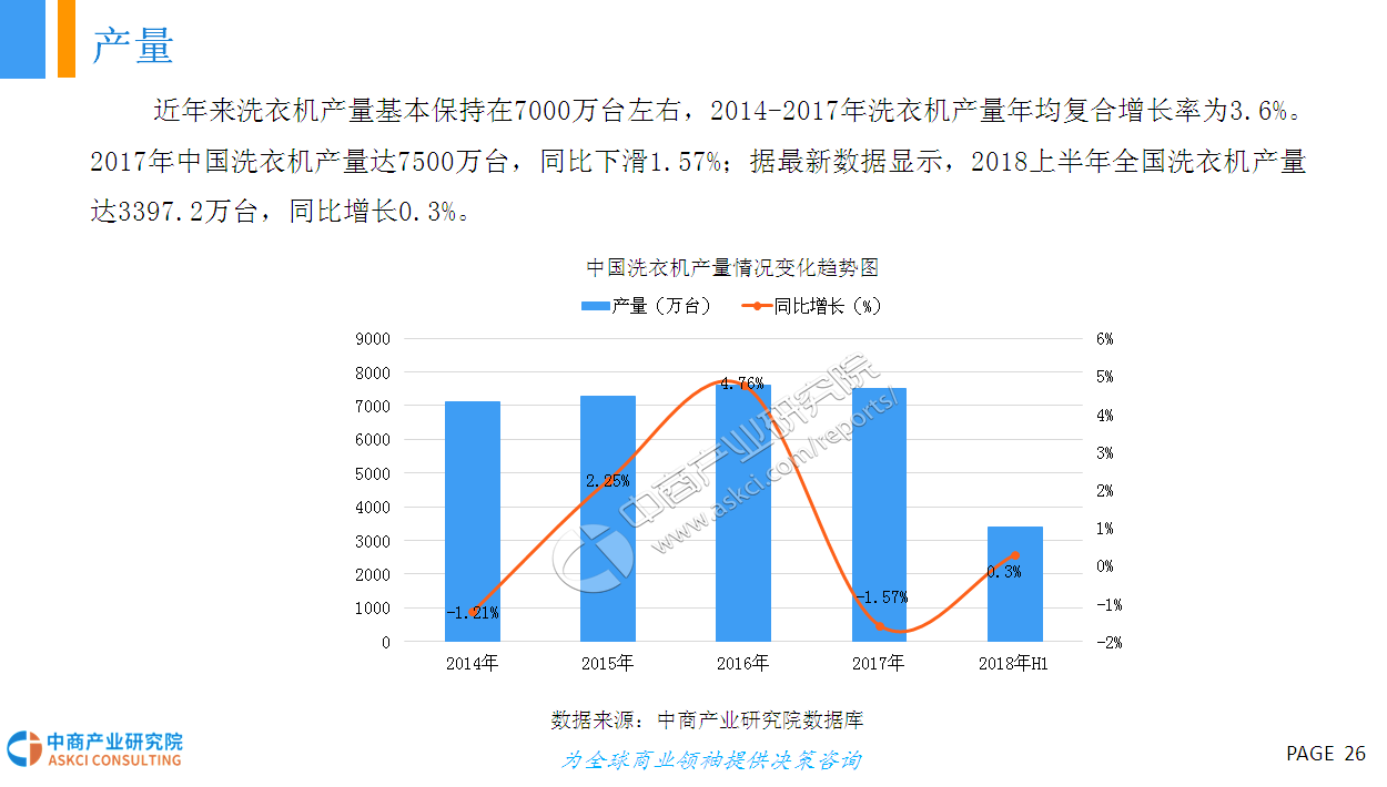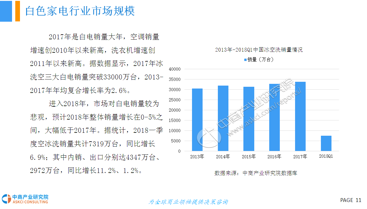 2017年是白电销量大年,空调销量增速创2010年以来新高,洗衣机增速创2011年以来新高。据数据显示,2017年冰洗空三大白电销量突破33000万台,2013-2017年年均复合增长率为2.6%。进入2018年,市场对白电销量较为悲观,预计2018年整体销量增长在0-5%之间,大幅低于2017年。据统计,2018一季度空冰洗销量共计7319万台,同比增长6.9%;其中内销、出口分别达4347万、2972万台,同比增长11.2%、1.2%。