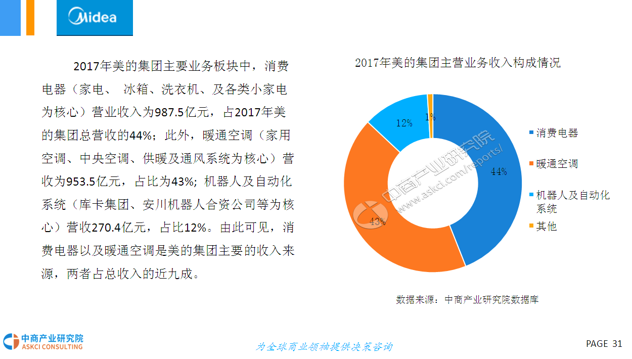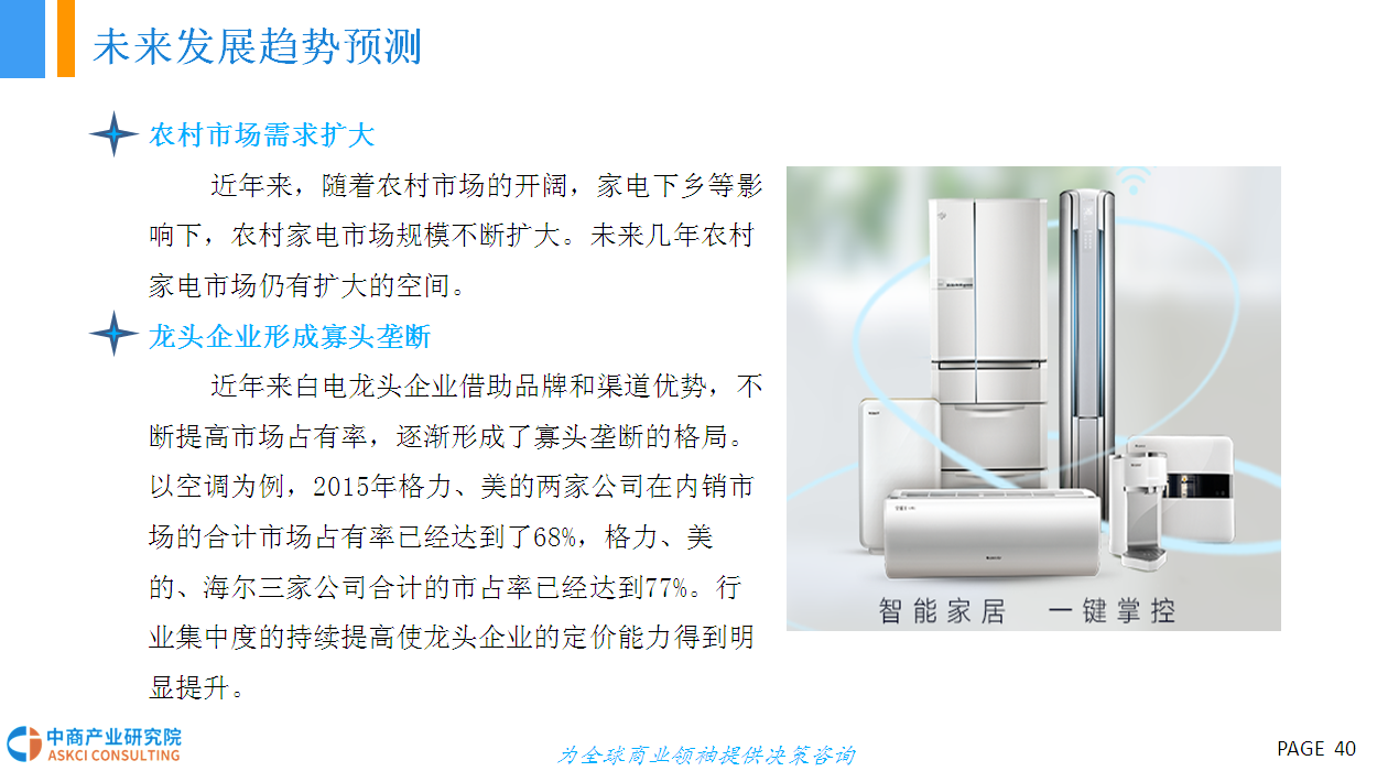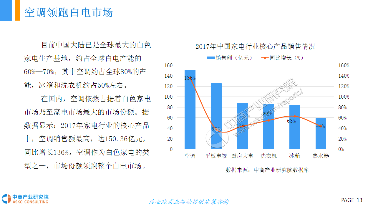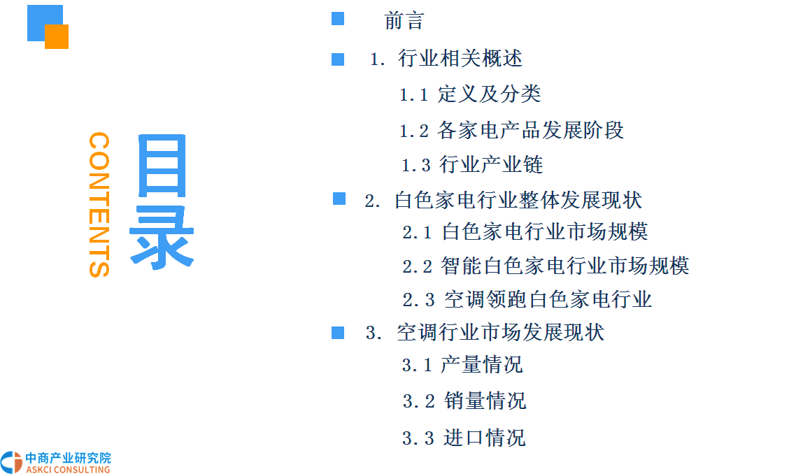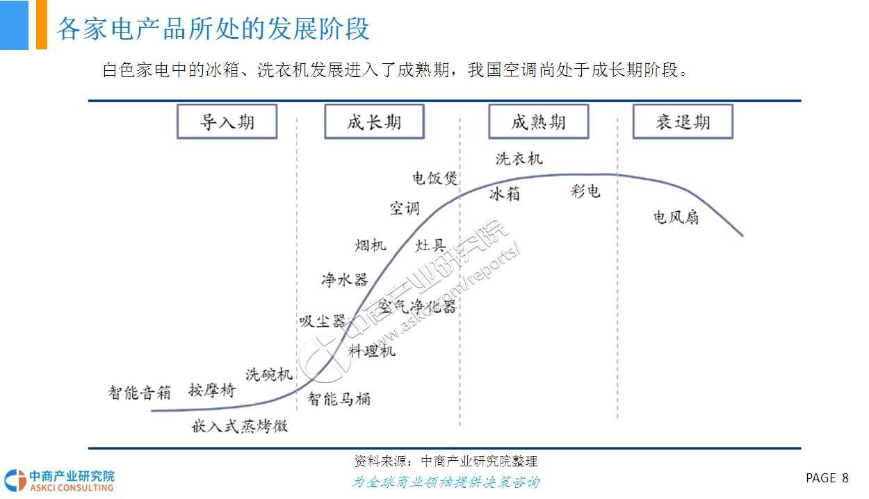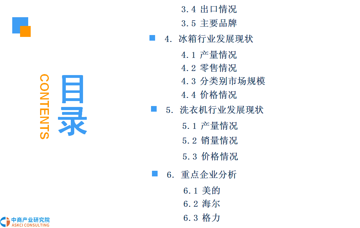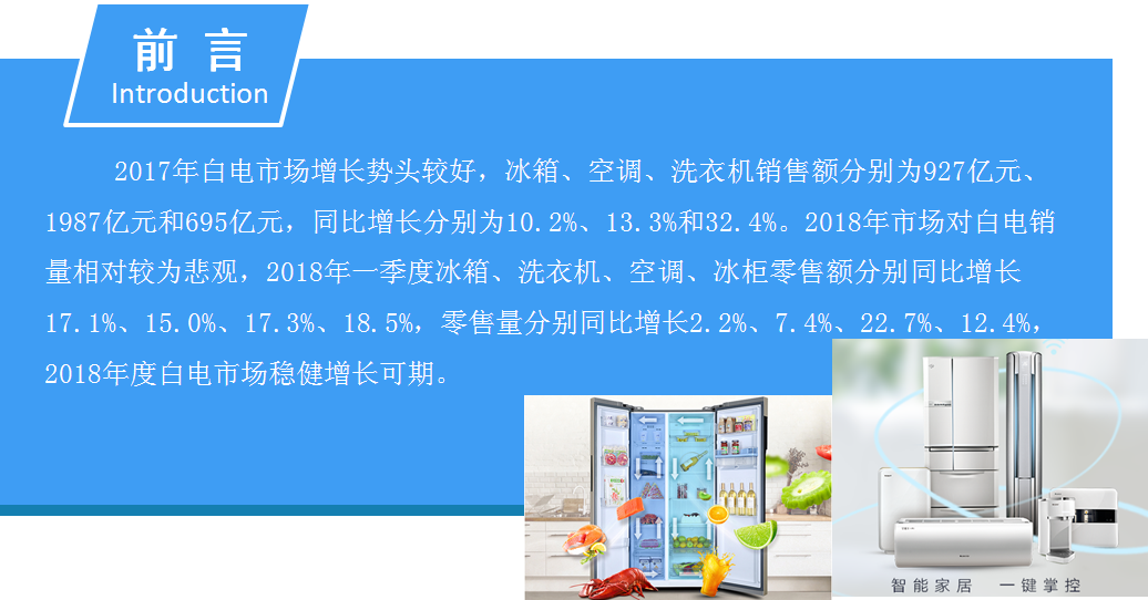 家用电器行业一般可细分为三个子行业:白色家电、黑色家电和小家电。而白色家电(简称“白电”)一般是指可以替代人们家务劳动的电器产品,主要包括洗衣机、部分厨房电器和改善生活环境提高物质生活水平(如空调、电冰箱等)。早期这些家电大多是白色的外观,因此而得名。