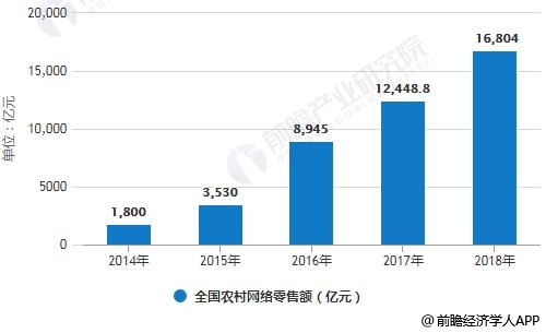据前瞻产业研究院发布的《中国农村电商市场前瞻预测与投资规划分析报告》统计数据显示,截止到2017年全国农村实现网络零售额为12448.8亿元,同比增长39.1%。预计2018年农村网络零售额将突破1.6万亿,涨幅或有望超过35%。截至2017年底,农村网店数达985.6万家,同比增长20.7%,带动就业人数超过2800万人。预计到了2018年农村网店数将达1200万家,带动就业人数将超3500万人。