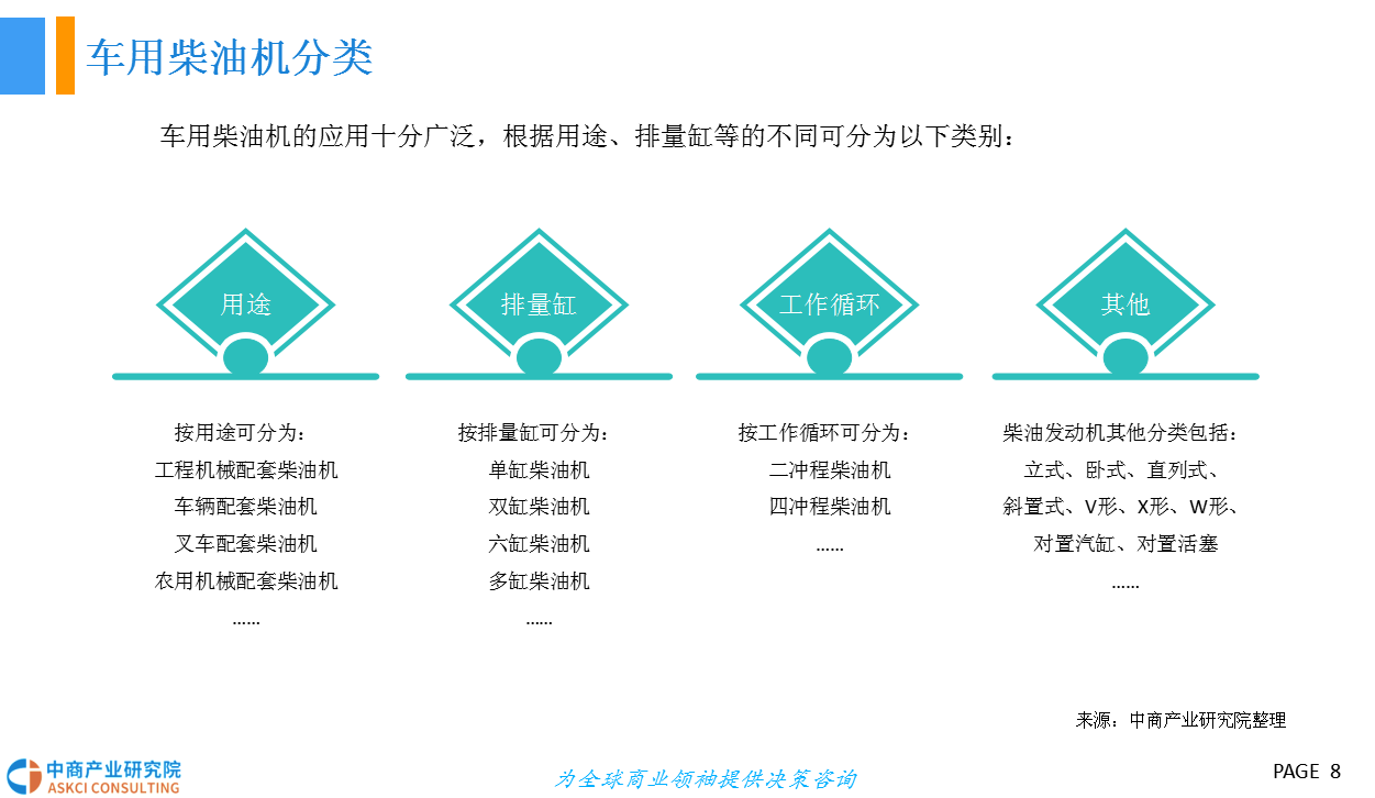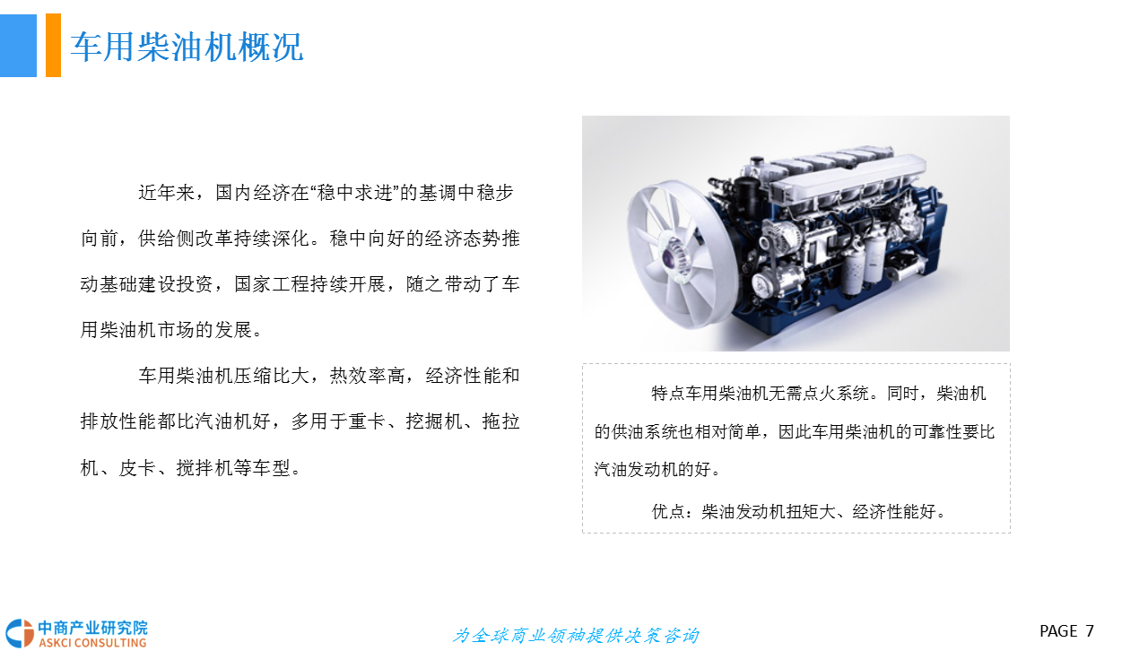 近年来,国内经济在“稳中求进”的基调中稳步向前,供给侧改革持续深化。稳中向好的经济态势推动基础建设投资,国家工程持续开展,随之带动了车用柴油机市场的发展。车用柴油机是燃烧柴油来获取能量释放的发动机,广泛用于重型汽车、大型客车、工程机械车等。