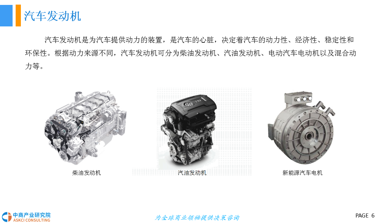 汽车发动机是为汽车提供动力的装置,是汽车的动力源。根据动力来源不同,汽车发动机可分为柴油发动机、汽油发动机、电动汽车电动机以及混合动力等。