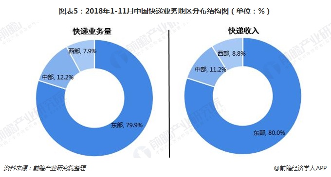 2018年1-11月,中国东、中、西部地区快递业务量比重分别为79.9%、12.2%和7.9%,业务收入比重分别为80%、11.2%和8.8%。与去年同期相比,东部地区快递业务量比重下降了1.2个百分点,快递业务收入比重下降了0.9个百分点;中部地区快递业务量比重上升了0.6个百分点,快递业务收入比重上升了0.4个百分点;西部地区快递业务量比重上升了0.6个百分点,快递业务收入比重上升了0.5个百分点。我国快递业务仍以东部为主,但逐渐向全国各区域扩散。