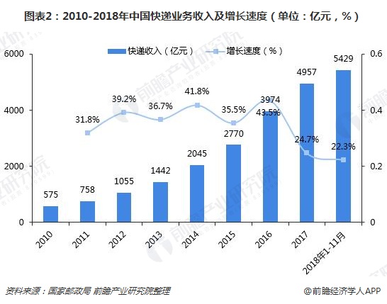 根据国家邮政局发布的数据,近几年我国快递业务量逐年上升,2017年突破400亿件,达到400.6亿件,同比增长28.2%,连续4年稳居世界第一,年业务量占全球45%以上,对世界快递增长贡献率超过一半;快递业务收入完成4957亿元,同比增长24.7%。2018年1-11月,全国快递服务企业业务量累计完成452.9亿件,同比增长26.3%,业务收入累计完成5429亿元,同比增长22.3%。
