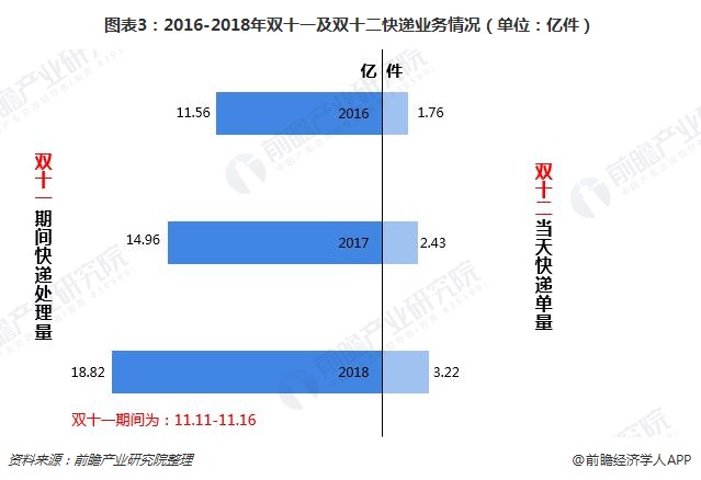 每年的双十一是快递业务的高峰期,双十二是小高峰期。2018年的双十一和双十二快递业务再次创新高。2018年双十一期间(11月11日-16日),全国邮政、快递企业共处理邮(快)件18.82亿件,同比增长25.8%;双十二当天,邮政、快递企业共揽收邮(快)件3.22亿件,比去年同期增长32.5%。