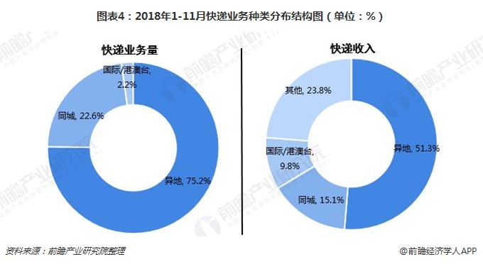 在我国,国内异地快递业务是主流。2018年1-11月,全国快递业务量完成452.9亿件,其中,同城业务量累计完成102.4亿件,占22.6%的比重;异地业务量累计完成340.5亿件,同比增长26.9%,占比达75.2%;国际/港澳台业务量累计完成10亿件,同比增长36.7%,占2.2%。从快递收入来看,2018年1-11月,异地快递业务收入占总收入的51.3%,同城以及国际/港澳台分别占15.1%、9.8%。