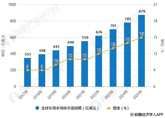 2017-2025年全球半车用半导体市场规模统计及增长情况预测