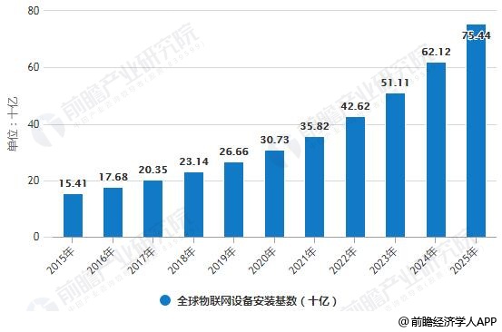 据前瞻产业研究院发布的《中国物联网行业应用领域市场需求与投资预测分析报告》统计数据显示,2015年全球物联网设备安装基数为154亿,截止到2017年全球物联网设备安装基数突破200亿。预计2018年全球物联网设备安装基数将达231亿。预计2020年全球物联网设备安装基数将增长至307亿。预计到了2025年全球物联网设备安装基数这一数字将达754亿。