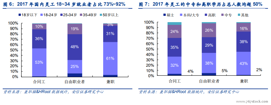 按灵工就业者的画像拆分来看,年轻人和中专高职等学历背景的人才为核心。2017 年国内的灵工从业者按合同性质可分为合同工(占总人数 41%)、兼职(占比 37%)和自由职业(占比 22%)。进一步拆分,可得到:①年龄 18~34 岁的灵工就业者占比达 73%~92%:灵工的从业企业多为世界知名 500 强企业和中大型国企,且工作时间自由度高,因此对想在知名大企业中得到工作经历,以及对时间灵活度要求较高的年轻人从业意愿较强,而超过 35岁的从业者更多偏向于稳定的岗位,对灵工从业意愿低。②中专和高职学历的占总人数超50%:由于灵工的大多数岗位以基础劳动力输出型岗位为主,例如零售行业的业务员、通信行业的客户中心等,对专业性要求不高,因此中专和高职学历占大多数。不过,灵工从业者中同样有脑力劳动者(作家、编辑、专家等)或专业技能服务提供者,因此同样有硕士学历的就业者,但人数上占比为少数。
