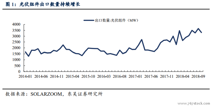 海外需求持续增长,为国内光伏龙头企业提供机遇。由于国内组件价格大幅下跌,导致海外许多国家的光伏已经实现平价上网,越来越多的发展中国家也开始使用光伏,装机量迅速增长。同时随着 2018 年 9 月欧盟正式取消对华光伏产品反倾销和反补贴措施,中欧间光伏恢复自由贸易。531 以来低迷的国内市场和日益增长的海外需求,使得越来越多的光伏企业开始寻求海外机会,国产组件出口数量持续增长;根据SOLARZOOM 的数据,2018 年 1-10 月我国出口组件数量达 31GW,同比增长 48%。