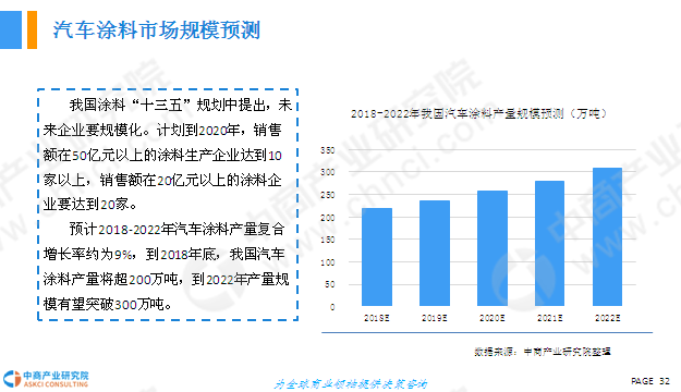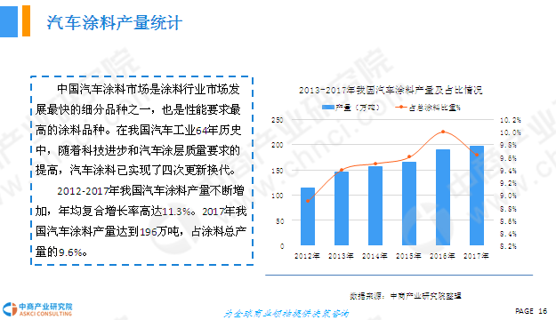 中国汽车涂料市场是涂料行业市场发展最快的细分品种之一,也是性能要求最高的涂料品种。在我国汽车工业64年发展历史中,随着科技进步和汽车涂层质量要求的提高,汽车涂料已实现了四次更新换代。随着汽车产销量及保有量的增长,我国汽车涂料市场前景广阔。2017年我国汽车涂料产量达到196万吨,占涂料总产量的9.6%。预计2018-2022年汽车涂料产量复合增长率约为9%,到2022年产量规模有望突破300万吨。