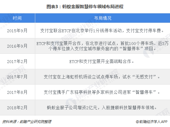 第二类是互联网公司,主要通过收集空余车位数量然后发布,盈利方式是对用户数据的再挖掘。例如,蚂蚁金服就先后多次布局智慧停车领域。2015年,蚂蚁金服旗下支付宝与中国元老级的智慧停车平台ETCP达成合作,共同推广智慧停车;2017年7月,实际执行在上海虹桥机场设立试点停车场,试水“无感支付”;2018年2月,进一步入股智慧停车发展代表性企业捷顺科技。