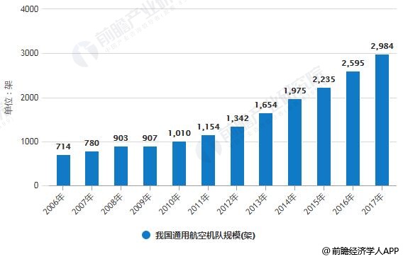 近年来我国通用航空机队规模保持较快增长。据前瞻产业研究院发布的《中国通用航空业市场前瞻与投资战略规划分析报告》统计数据显示,2017年,我国机队规模达到2984架,通用航空飞行小时从2010年的37万小时增加到2017年的84万小时,年均复合增长率为12%。预测到2035年我国通用航空网络将初步形成,通用航空年飞行小时将达到600万小时,机队规模将达到2万架以上。