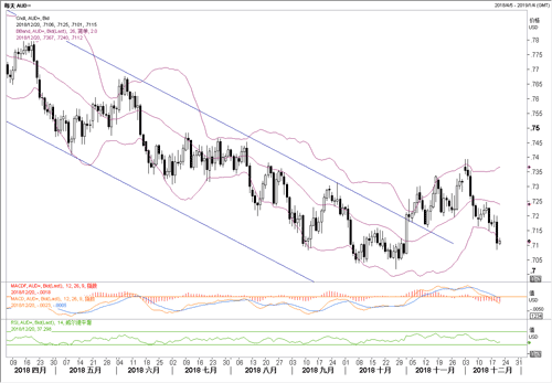 美联储上调了利率,在外汇市场上,这一结果对澳元的影响似乎超过了其他任何货币。鉴于澳洲联储预计在2019年将维持利率不变,而美联储暗示2019年会加息两次,澳元立即承受下行压力,澳元昨日也因此出现跳水行情,下跌直逼0.71水位。目前短线上澳元出现超卖,且在0.71水位处暂时得到支撑,如果澳洲方面打后不出现负面的经济数据,料汇价将会围绕该水平进入盘整,后市上升依然可期。若是按昨日建议在0.71附近设置多头澳元的订单被触发,可暂时持有观察,止损位置控制在0.7060之下。