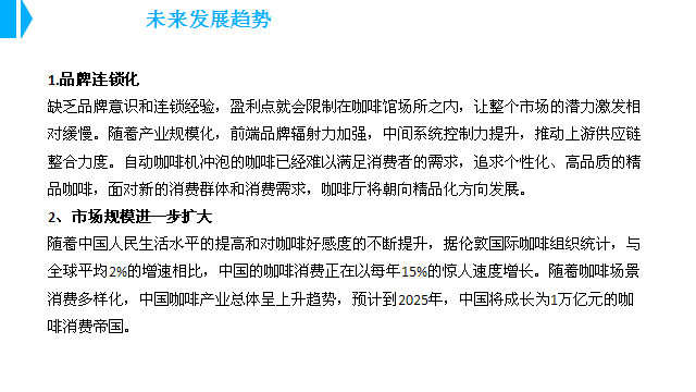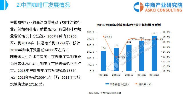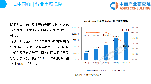 随着我国人民生活水平的提高和对咖啡文化认知程度不断增长,我国咖啡产业总体呈上升趋势。据统计数据显示,2017年中国咖啡市场规模达到1628.8亿元,增长率达到39.9%;随着人们消费观念的转变,西方的商品及消费习惯慢慢被接受,预计2018年市场规模将有望突破2000亿元大关。
