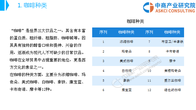 “咖啡”是世界三大饮品之一,其含有丰富的蛋白质、粗纤维、粗脂肪、咖啡碱等。因其具有独特的醇香口味和提神、兴奋的作用,逐渐成为现代人不可缺少的日常饮品。咖啡在全球贸易中占据重要的地位,更是西方文化的象征之一。